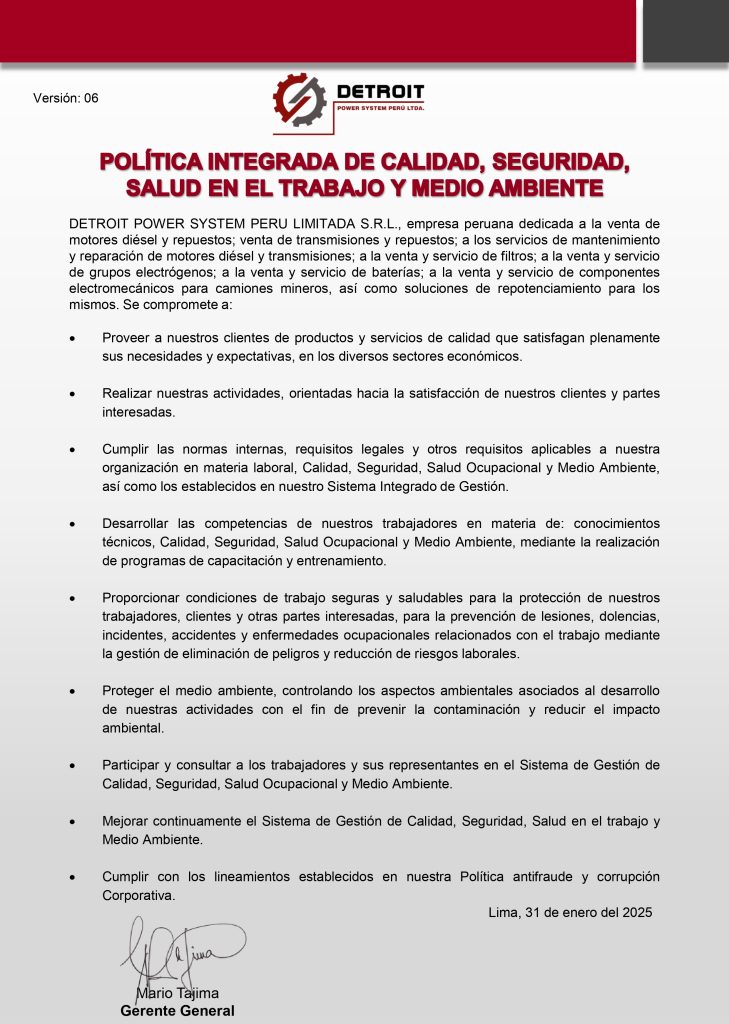 Detroit Power System Perú es una empresa peruana especializada en el diseño y desarrollo de soluciones de trenes de potencia destinadas a sectores industriales estratégicos. Nuestra firma se distingue por contar con un equipo humano altamente comprometido y el respaldo de reconocidas marcas internacionales. Nos enorgullece ofrecer a nuestros clientes soluciones personalizadas a lo largo de toda la cadena de valor.