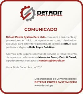 Detroit Power System Perú Ltda. comunica a sus clientes y proveedores
